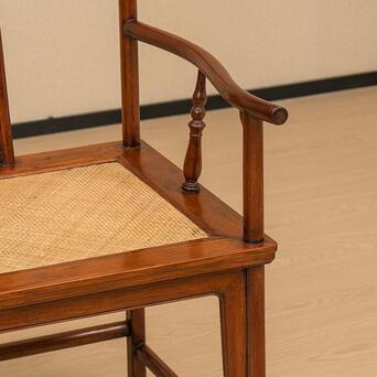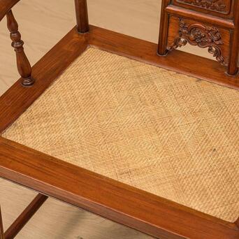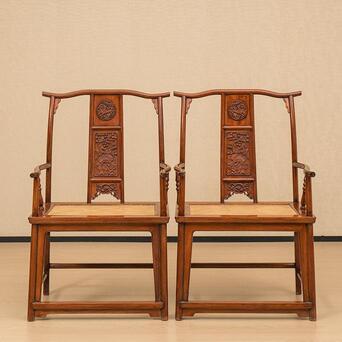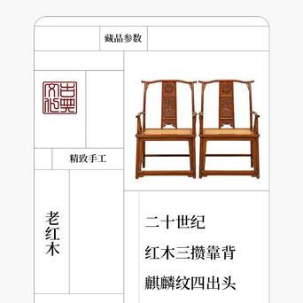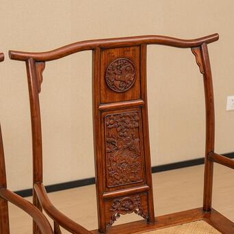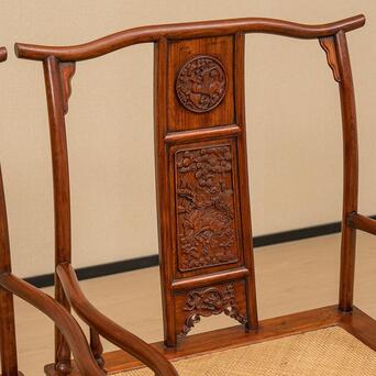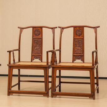 此对官帽椅形制经典,采用上好的红木料制成,纹理明晰而美观,色泽润泽雅致。S型搭脑弯弧有力,中成枕形,两端出平切头向后弯曲,曲线柔婉,活泼可爱。靠背板三攒,呈C型,依靠舒适,上半部分作圆形开窗雕凤纹,中部方形开窗内雕麒麟纹,下方锼挖出壸门亮脚。扶手用圆材,弯转如游龙,与搭脑遥相呼应,下方则接鹅脖、联帮棍以稳固结构。椅面攒框装藤编软屉,坐感舒适,边抹冰盘沿,下设光素券口。腿足圆材直足落地,下部腿间饰以步步高赶枨,寓意步步高升。正面管脚枨又装素工刀牙板。