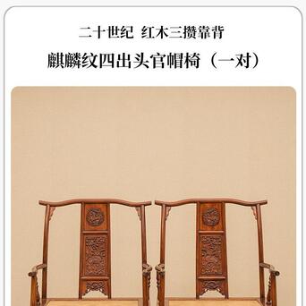 炒股配资推荐 二十世纪 红木三攒靠背麒麟纹四出头官帽椅(一对) 尺寸:65.8×5